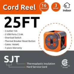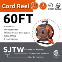 Link2home Durable 60 Ft Heavy-Duty Extension Cord Reel W/ 4-Power Outlet And 14 Awg Cable